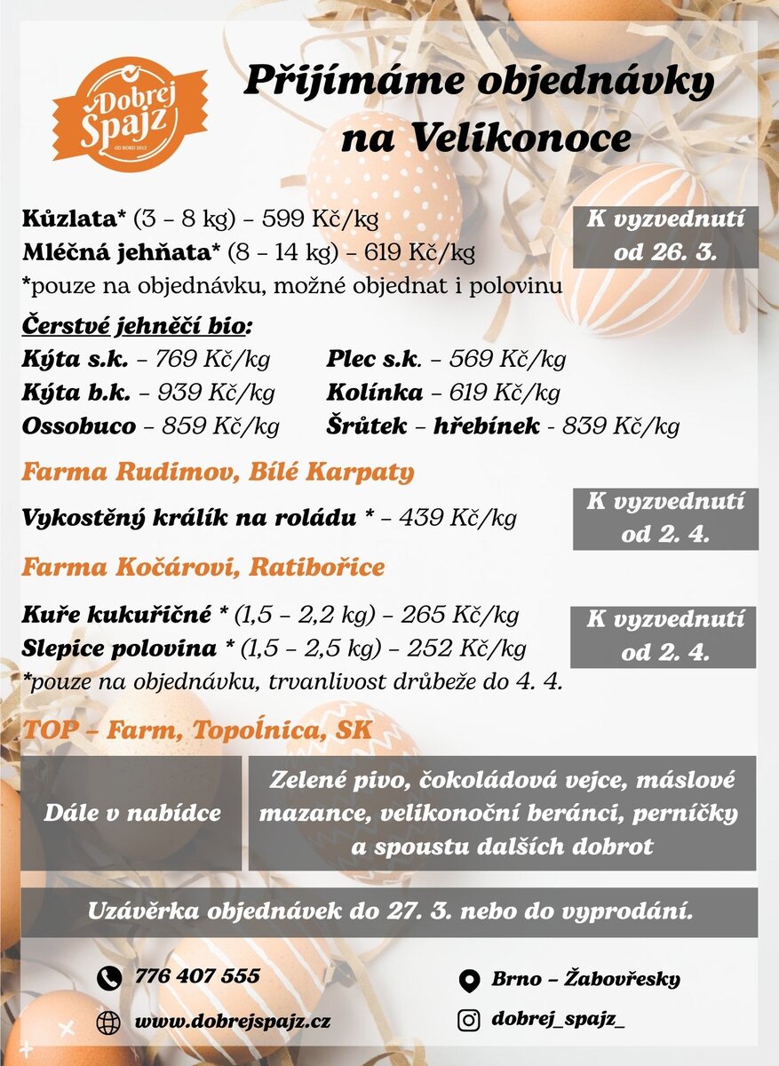 Právě jsme zahájili příjem objednávek na Velikonoce, tak si nezapomeňte včas objednat. Počty některých položek jsou omezené.
